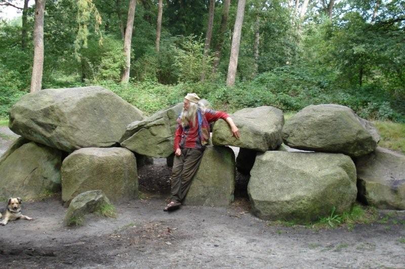 Bij Anloo zie ik om half elf een picknicktafel vlak bij een hunnebed. Een mannetje met een grote baard en ongewassen kleren vertelt honderd uit over deze keien. Hij heeft een heel eigen visie. Het zijn geen grafkelders maar afbeeldingen van de vrouwelijke baarmoeder, zegt hij.