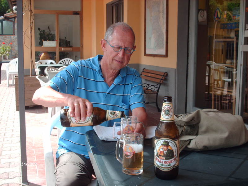 ’s Avond drinken we een biertje in de plaatselijke kroeg. Het regent nog steeds. De vader van de pensionbaas komt ons de groeten doen. Dat wil zeggen. Hij neemt ook een paar bier met een enkele andere oude maten.