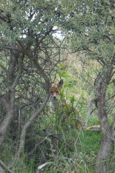 Niet alleen bij de auto van Waternet maar ook een stuk verderop staat een vos me aan te kijken. Als ik dichterbij kom gaat hij achter een bosje staan.