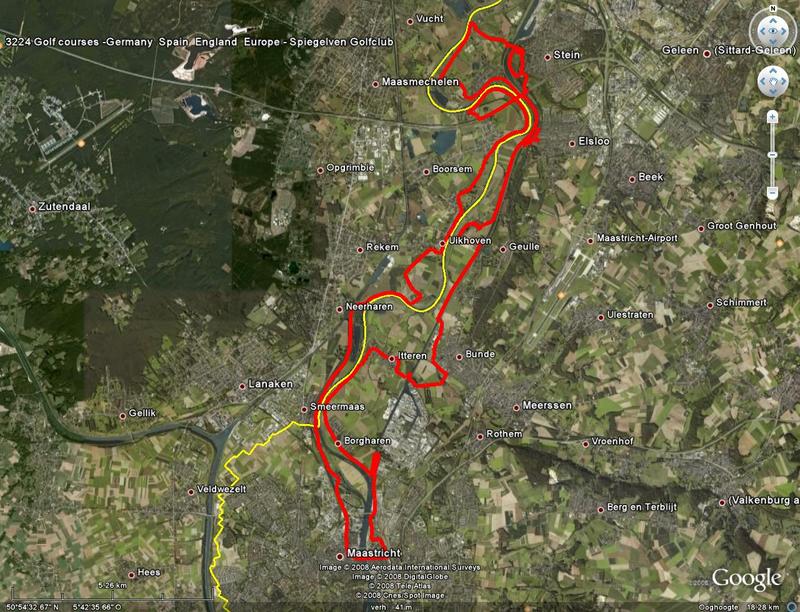 Fietsen langs de Grensmaas. Rood is de route en geel is de grens.