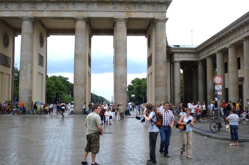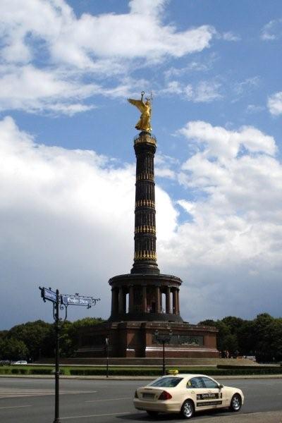 We fietsen over een fietspad dat over de Spree gaat langs de Bondsdag. We rijden naar de Brandenburger Tor. Vlakbij gaat het even flink regenen. We ′schuilen′ onder de Tor. Daarna fietsen we naar de Siegersäule (overwinningszuil). De wegen zijn hier erg breed. Het lijkt Parijs wel. Onderweg is een indrukwekkend Russisch monument.