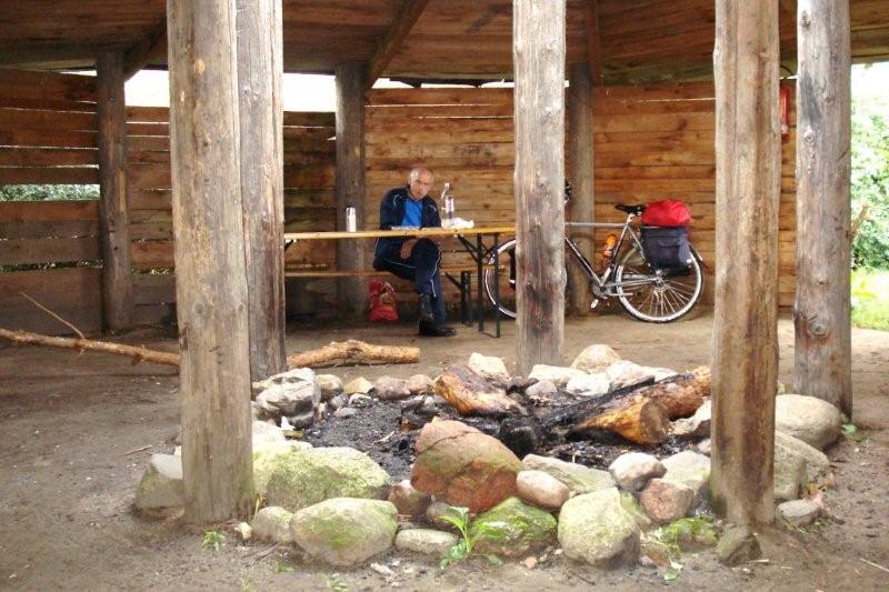 Om 8 uur broodjes afhalen bij de receptie. Eerst een stuk over de dijk met wind mee. Later zal de wind gaan draaien naar tegenwind. De eerste plaats van enige betekenis is Haldensleben. Hier doen we boodschappen en nemen onze eerste bak koffie van vandaag. Inmiddels hebben we al een tijdje in de regen gereden.