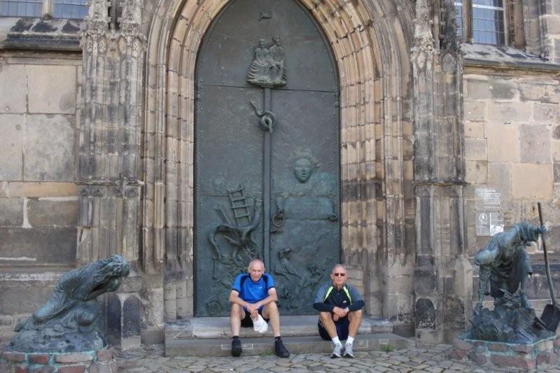 We maken een foto van de Johanneskirche, de oudste kerk van Magdenburg. Koffie en Apfelstrudel nemen we op het Oude Marktplein. Er staan daar niet veel oude gebouwen meer. In de dom zien we een Nederlands stel dat we ook al bij de Johanneskerk spraken. Ze hebben ook het Hundertwasserhaus gezien, wat ze nog mooier vinden dat die in Wenen. De dom valt tegen. De pilaren die na WO II zijn gemaakt zijn van beton in plaats van van natuursteen. Ook zijn niet alle ornamenten opnieuw gemaakt na de verwoestingen van 1945.