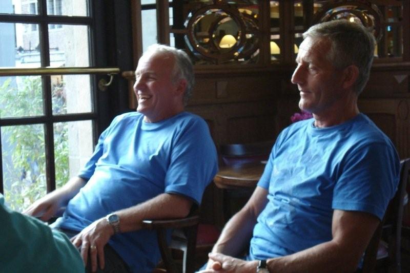 Voordat we ′s avonds de stad in gaan voor muzikale optredens op de Grote Markt en in de Spiegelzaal naast ons hotel, babbelen we wat met Engelse mensen, die ook een paar dagen op stap zijn in Brussel. Kees heeft net als één van de mensen uit Cambridge een blauw t-shirt aan. Omdat zowel wij als de Engelsen een Kwakbiertje ophebben is de stemming uitgelaten.