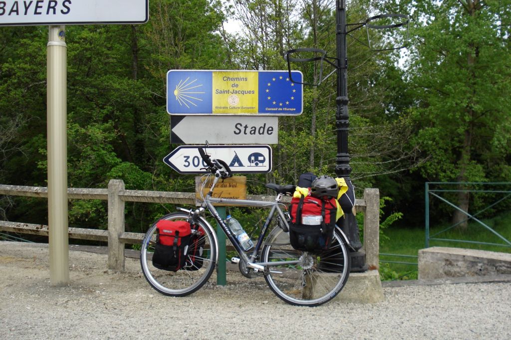 Als ik in Angoulême ben zie ik al snel de borden met Auberge de jeunesse. Prachtig. Drie km verder sta ik voor de jeugdherberg. Die is gesloten van 7 tot en met 11 mei. Ja, die mensen willen ook weleens vrij. Dan maar verder naar de binnenstad. De VVV is helaas gesloten. De kathedraal is open. Daar krijg ik een stempel, maar omdat de inkt bijna op is, lijkt hij niet erg mooi (ziet er niet uit). Het mevrouwtje in de kerk heeft haar best gedaan. Ze deed zelfs wat gewijd water op het stempelkussen, maar echt baten mocht het helaas niet. Omdat ik geen advies kan vragen bij de VVV vraag ik op een terras of ze daar weten waar de straten zijn van de hotelletjes die in mijn routeboek staan. Dat weet de ober niet, maar in elk geval niet in de binnenstad, hoog verheven boven de buitenwijken van de stad. Ik vraag hem of hij een goedkoop hotel weet. Dat weet hij. Ik vind het 1-sterrenhotel. De baas is het pand aan het schilderen. Ik kan mijn fiets in de garage zetten om de hoek een stukje lager dan de entree.