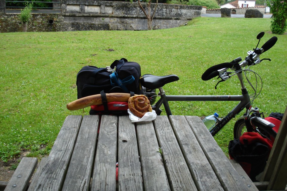 In Torsac zou volgens het routeboek een café zijn. Er is een restaurant maar dat gaat pas om 12:00 uur open. Volgens een boer, die ik erom vroeg, is er geen bakker in het dorp. Ik eet het restant van mijn stokbrood van gisteren op. Mijn ontbijt. Ronsenac is het volgende stadje. Hier ga ik voor koffie. Daar aangekomen is het restaurant ook dicht, waarschijnlijk de hele dag. Ik vraag aan een man die voor zijn deur staat waar de bakker van het dorp is. Hij vertelt dat de rijdende bakker ieder moment langs kan komen. “Daarom sta ik voor m’n deur”. Ze komt eraan in haar Peugeot minibestel. Ik neem een baquette en een soort gedraaide koek. De man voor zijn deur vraag ik de waterfles voor me te vullen. Ik kan er weer even tegen.