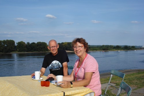 Op een terras op de Elbedijk drinken we een bakkie thee. We zijn van plan om in het centrum van Geesthacht een hotelletje te boeken. We komen voorbij deze plaats terecht in Krümmel. Daar we eerder, vóór de overgang via de brug, aan de linkeroever van de rivier reden, zitten we nu aan de andere kant.