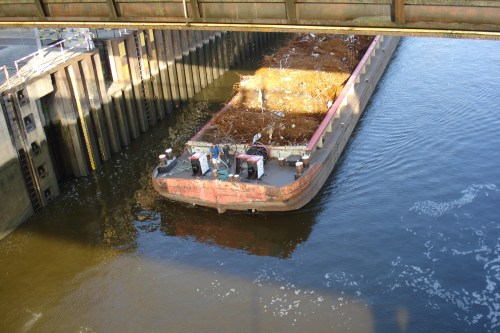 Het ging over een lange brug, inclusief een Elbe-eiland. Daar is een grote sluis met stuw en vistrappen. Toen we hier even stonden te kijken komt er een sleepboot met oud ijzer langs.