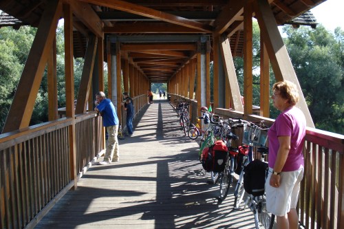 In Wörlitz bekijken we een park met een slot. De mevrouw die een groep Duitse toeristen rondleidt vraagt mij wat snauwerig om hier niet te fietsen maar af te stappen. De toegangsweg naar het dorp wordt nu vernieuwd evenals de brug. Deze laatste wordt in middeleeuwse stijl hersteld. Dat is nu nog niet te zien. Wel dat er volop aan gewerkt wordt. Pal aan het begin van het dorp staat een in verre staat van ontbinding verkerende Gaststätte die ook helemaal zal worden opgeknapt. Hier in Oost-Duitsland kan je zien waar de Europese subsidies blijven.