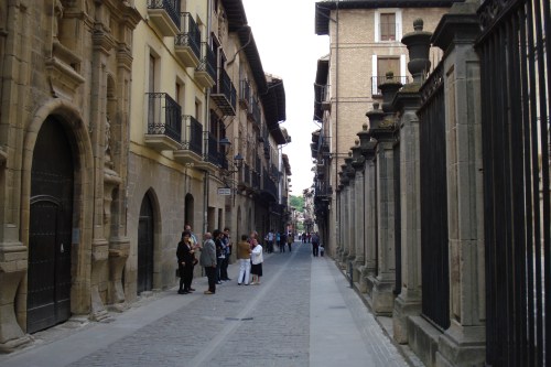 Los Arcos is de volgende stad die ik aandoe. Er is een plein met arcaden. De kerk is erg mooi, ook van binnen. Ook hier zijn ze de boel, met name heel hoog in de kerk, aan het restaureren. Links en rechts en ook achter het altaar is veel gebruik gemaakt van bladgoud. De gelovigen wanen zich hier een beetje in de hemel. In Los Arcos zit ik tijdens een bakkie koffie op een terras te praten met een stel uit Zwitserland. De Zwitserse vrouw zegt in eens: Er wordt naar je geroepen. We zitten in een smal zijstraatje. Ik loop snel naar de doorgaande weg en zie Koos en Ben langsfietsen. Ik zal ze vandaag nog twee keer tegenkomen.