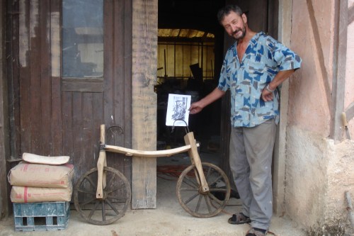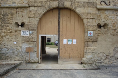 Bij Marre zie ik een bord met opschrift hotel en restaurant. Misschien kan je daar wel koffie drinken. Een man in ontbloot bovenlijf is een nieuwe houten fiets aan het maken aan de hand van een foto van zo′n fiets. ′U bent alleen op de fiets? Hier kunt u koffie drinken. Dat is goed voor een vermoeide fietser. ′Hij verwijst mij naar een terras. Het ziet er hier allemaal heel bijzonder uit. Als ik later naar de wc ga in het restaurant, zie ik dat bijna alles is gemaakt in middeleeuwse stijl. Misschien is het wel leuk om hier te overnachten in plaats van in Verdun. Ik vraag wat het kost voor mij alleen en of er nog plek is. Er blijkt geen plaats meer te zijn. Ook vind ik 70 euro aan de hoge kant voor een nachtje slapen. Omdat ik verschillende WIFI-bordjes hier zie hangen, vraag ik of ik de code mag gebruiken. Dat kan maar dan moet eerst mijn naam genoteerd worden. Echter na die ceremonie krijg ik geen verbinding met internet. De eigenares, die alleen Frans spreekt, weet ook niet hoe het komt. In het hotel zou het wel werken. Pas de problem! Dan schrijf ik mijn verhaal maar in Word. Daarbij komt dat het nu echt regent. Ik zit hier droog. Als ik hier wegfiets is het nog niet droog. Ik heb niet voor niets mijn regenkleding meegenomen.