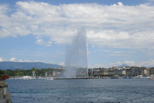 In Genève heb ik nu ruim twee uur overstaptijd. Daarom even naar het Meer van Genève. Als ik de fontein zie spuiten, herinner ik me een eerdere keer dat ik hier was samen met Joke. Dan het lastige van de Zwitserse frank. Je kunt hier wel met euro′s betalen, maar dan krijg je van die stomme franken terug. Toch maar wat eten, wat drinken en drinken mee voor in de trein. Op een groot scherm staat dat het hier 28 graden is en in Basel zelfs 30 graden.