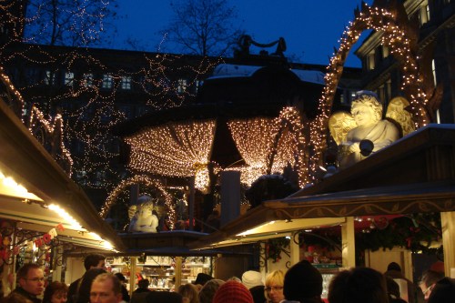 Etalages zijn al vanaf half november in de kerstsfeer. We drinken glühwein op straat bij een speciaal daarvoor ingericht stalletje. Je moet statiegeld betalen voor je beker. De mijne neem ik mee in mijn koffer. Een Duits stel raadt ons aan om ook de omgeving van het stadhuis, das Rathaus, te bekijken.