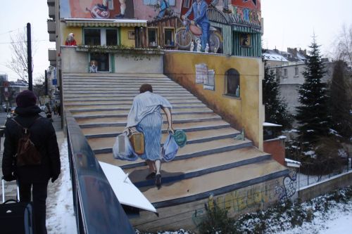 Onderweg van het station, Hauptbahnhof, naar het hotel, zien we deze muurschildering. Je zou zweren dat het een echte trap is, waar deze mevrouw in zomerjurk, naar boven gaat.