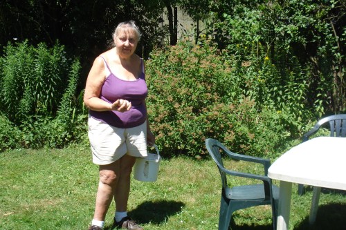 In Gembes, een dorpje van niks, zie ik een pand waarop op borden staat geschreven dat ze omeletten, spek met ei, enz. verkopen. Ook verhuren ze nog kamers en hebben een minicamping. Achter moet een tuinterras zijn. Ik loop de gang door naar achteren. Alles ziet er oud en weinig onderhouden uit. Een oude dame, die overigens goed Nederlands spreekt, spreekt me aan. Ik vraag of ik wat kan eten. Dat kan. Ze zegt: ′Ik heb de grote tafel in de tuin gisteren schoon gemaakt. Er zal een enkel blaadje opliggen′. Ze vraagt me om een enkele zaken zelf mee naar achteren te nemen, omdat ze slecht ter been is. Voor mij maakt ze een omelet met spek, tomaten en ajuinen. Als ik zit te eten gaat zij de kippen en het ′zwijn′ voeren. Het varken eet gekookte mais. Dat vindt hij lekker en is ook nog eens goedkoper dan voedermeel voor varkens. Ze zegt tegen me dat ze voor de camping euro 3 rekent plus euro 2 voor het douchen. Ze vraagt of ze in plaats van die euro 3 wel euro 5 kan vragen. Ik adviseer haar dat te doen. Na afloop gaat ze op de foto. Ze vraagt of ze een beetje naar achteren mag staan, omdat ze een beetje dik is. Dat is voor mij geen probleem. Ik kan haar inzoomen met de digitale camera.