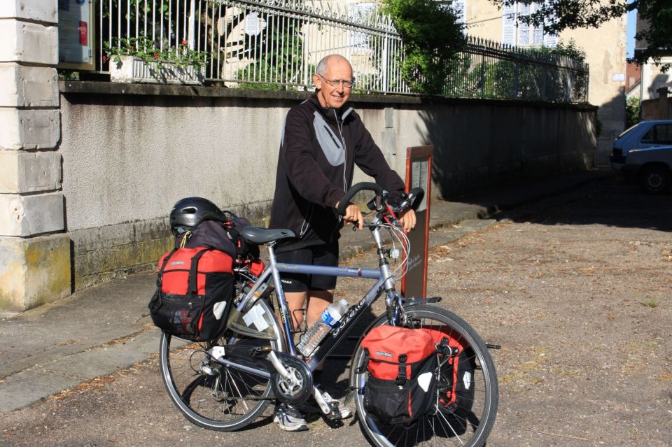 Als ik in Vézelay aankom is het al weer even droog. Het is warempel weer zonnig. Mijn lunch eet ik samen met een Duits stel dat in de buurt van Frankfurt aan de Main woont. Ze fietsen aan de hand van een autokaart. Ideaal vinden ze het niet. Ze zijn onderweg naar Santiago.