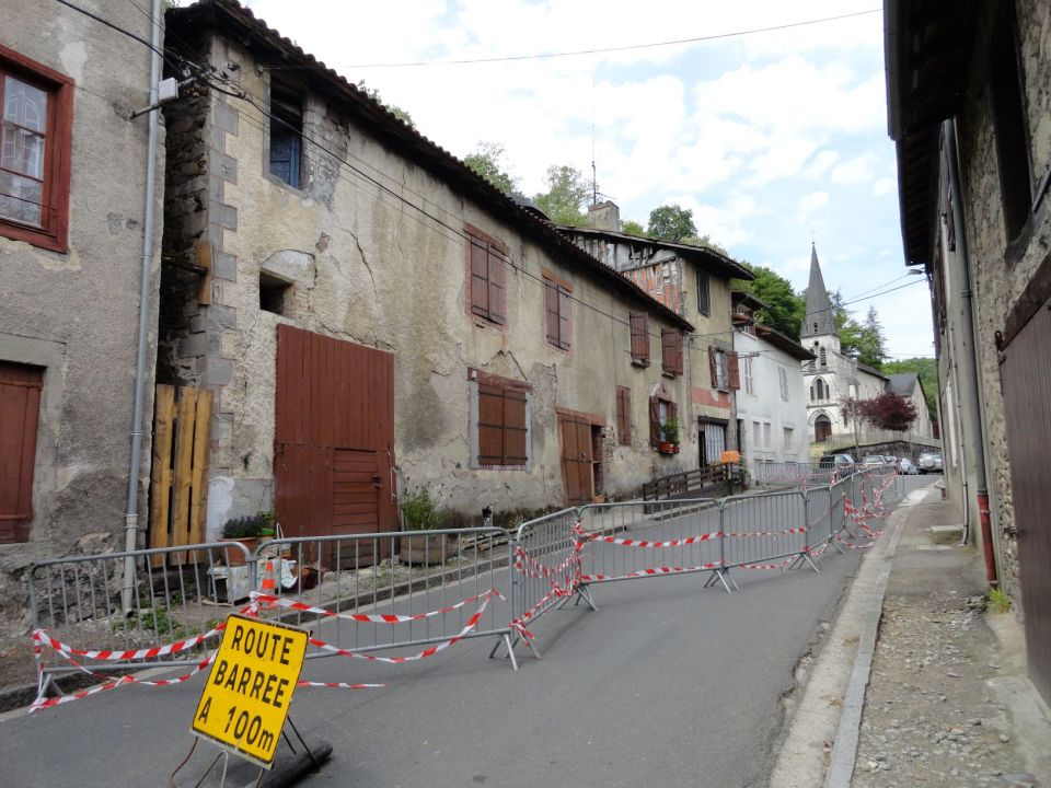 Vóór St. Léonard-de-Noblat staat op verschillende plekken aangegeven dat de weg is opgebroken en dat het verkeer daarom een andere route moet nemen. Ik weet uit ervaring dat je als fietser er meestal nog wel langs kunt. Maar het blijft een gok. Ik neem die gok. Het blijkt een huis te zijn die op instorten staat. Daar mag geen verkeer meer langs. Ik kan over de stoep aan de andere kant van de weg.