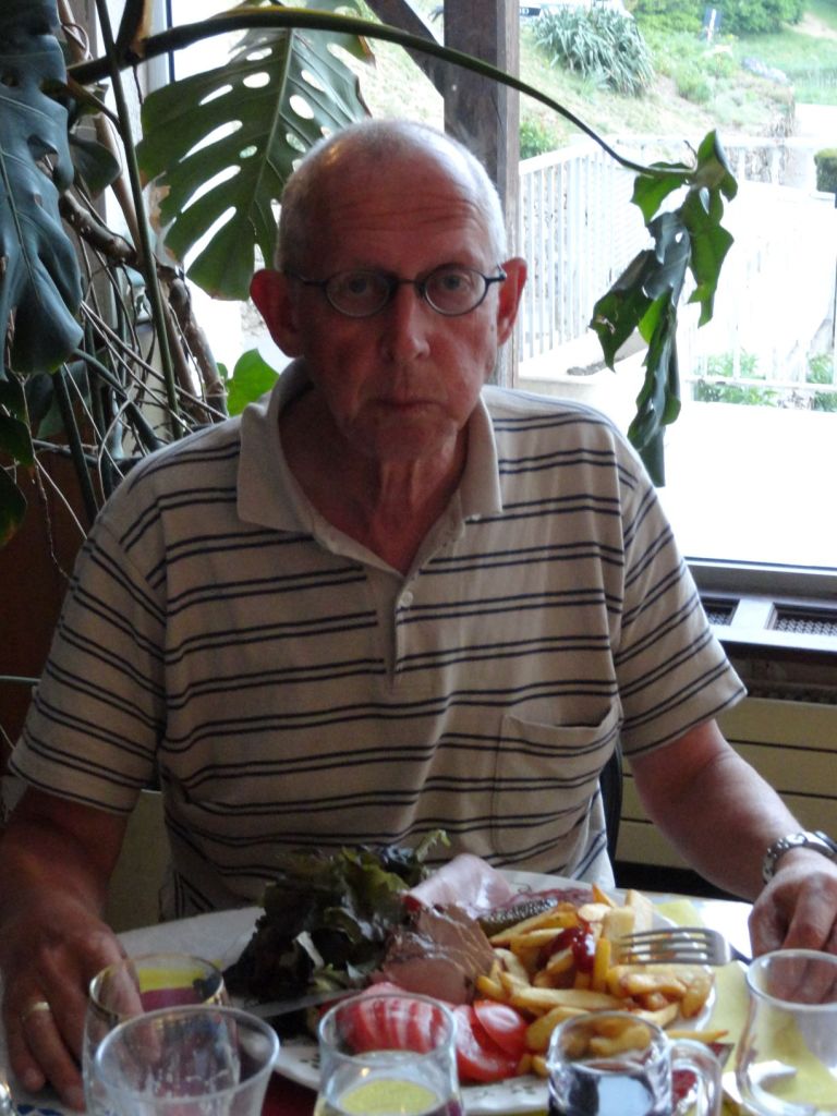 Als ik om half acht meld voor het avondeten schrikt de serveerster. Ze gaat naar de kok. Die weet van mijn aanwezigheid. Ik krijg in een hoekje vooraan in het gebouw vlak bij het terras een compleet bord met patat, sla, koude fricandeau en worst. Daarbij krijg ik een kan water en een kannetje rode wijn. Vooraf bestel ik een tapbiertje.