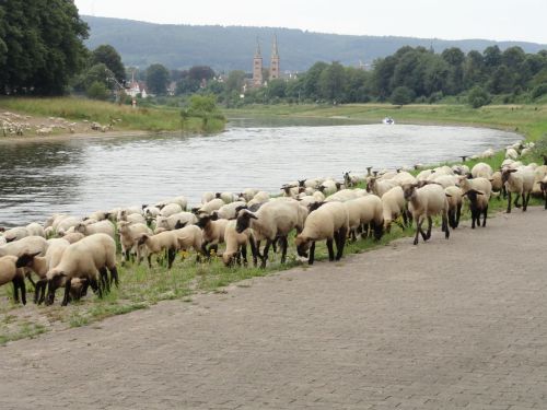 Als we de brug over zijn, zijn we niet langer in Nieder Sachsen maar in Nordrhein Westfalen. Höxter is de eerste grote plaats aan de westelijke kant van beide deelstaten. Een herder loopt hier langs de rivier samen met zijn hond en een kudde van zo’n 300 schapen.