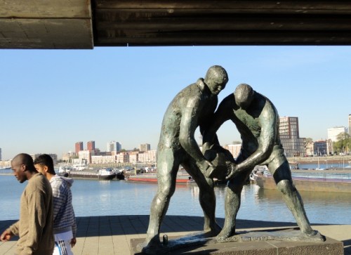 Aan de rand van de Tarwewijk staat onder een metroboog aan de Maashaven het beeld van de Dijkwerkers. In de Afrikaanderbuurt, hier niet ver vandaan, drinken we een kop koffie in een volkscafé waar een Marokkaanse jongeman achter de toog staat. Als we vertellen dat we aan de wandel zijn, vraagt hij waarom we niet naar Santiago de Compostela gaan wandelen. Hij zag daar een uitzending over op National Geographic TV.