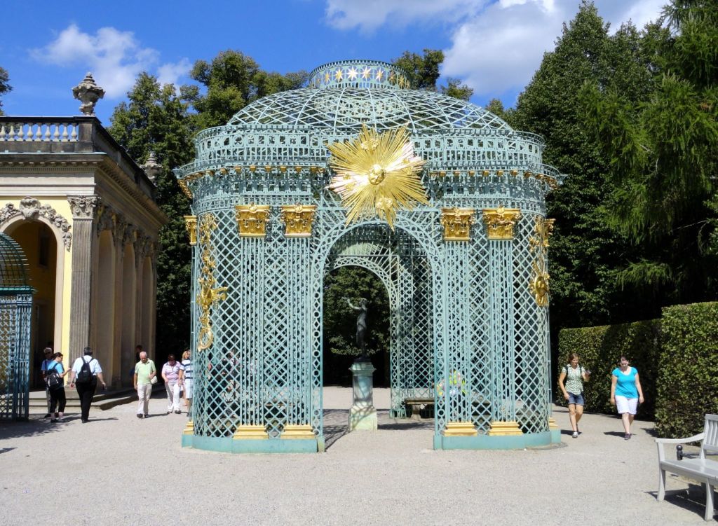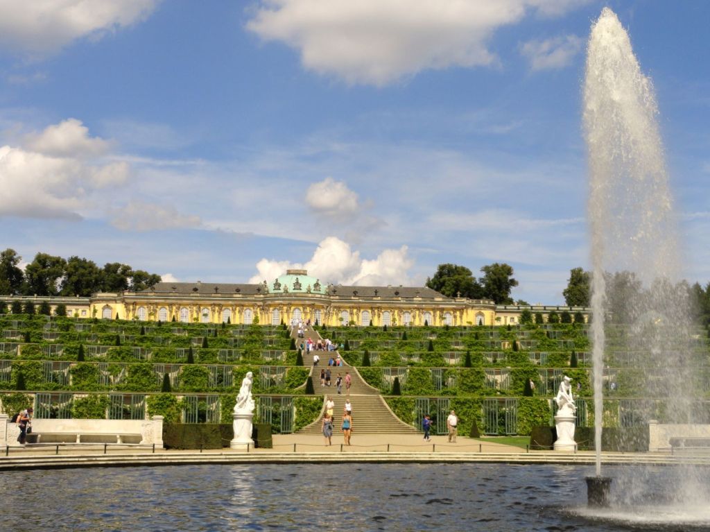Na een tijdje horen we dat we terug richting Friedrichstrasse moeten rijden en dan via een andere route de weg kunnen vervolgen naar Potsdam. Volgens een student die bij ons in een gereedstaand voertuig is gaan zitten is dat advies verkeerd en zal de groep mensen die dit advies opvolgen niet in Potsdam uitkomen omdat er in verband met groot onderhoud delen van metrolijnen voor langere tijd zijn afgesloten. Hij moet naar de Univesiteit in Golm vlak bij Postdam. Hij is de ‘reisleider’ van ons vieren en nog twee Spaanse vrouwen. We komen een stuk later in Potsdam aan dan we vanmorgen vroeg dachten. We stappen uit de bus bij het Neues Palaist in het Sanssouspark. Er is een hoop pracht en praal te zien.