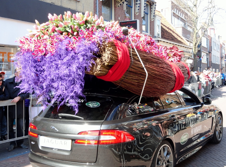 Vandaag kijken we in Lisse op de Heerenweg naar de jaarlijkse corso. Door het late begin van het voorjaar moesten er hyacintenbloemen uit Frankrijk worden ingevoerd, omdat er in Nederland niet genoeg waren. Het is hier het smalste deel van de route, die loopt van Noordwijk naar Haarlem. Een stukje verder bij ons aan de overkant staat een auto in een parkeervak. Voordat de stoet langs komt is de auto door medewerkers van een sleepbedrijf een stukje verder naar de kant gezet.