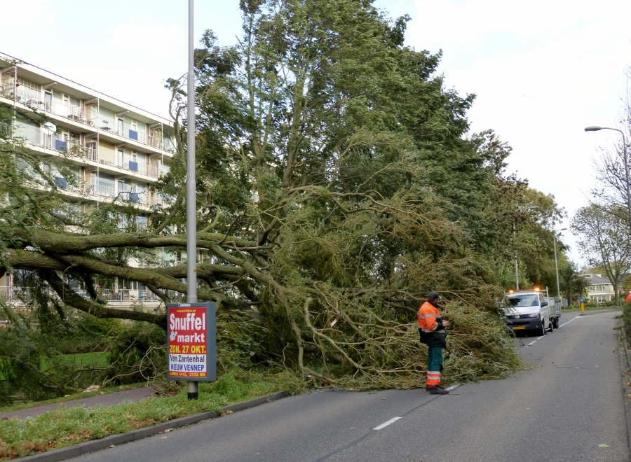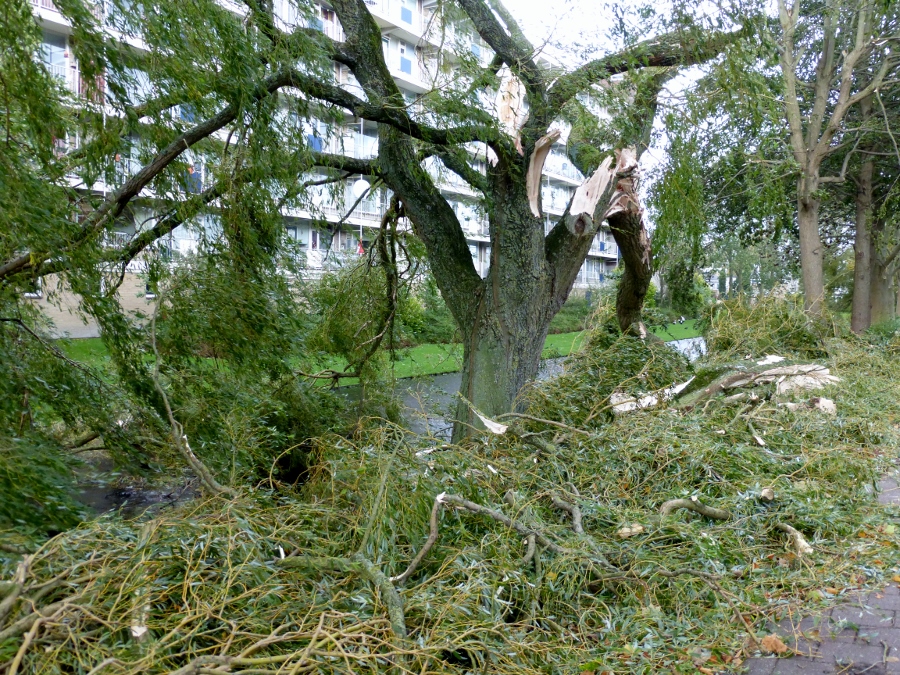 In het park bij onze tandarts is een boom omgewaaid tegen andere boom aan. Als die laatste boom het begeeft valt hij op de praktijkruimte. Joke en ik mogen vanmorgen hier in de stoel van de tandarts liggen. De praktijkkamer waar wij zijn ligt aan de goede kant van het gebouw, volgens de tandartsassistente.