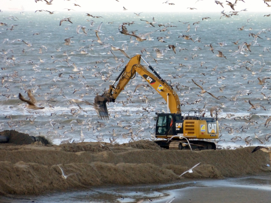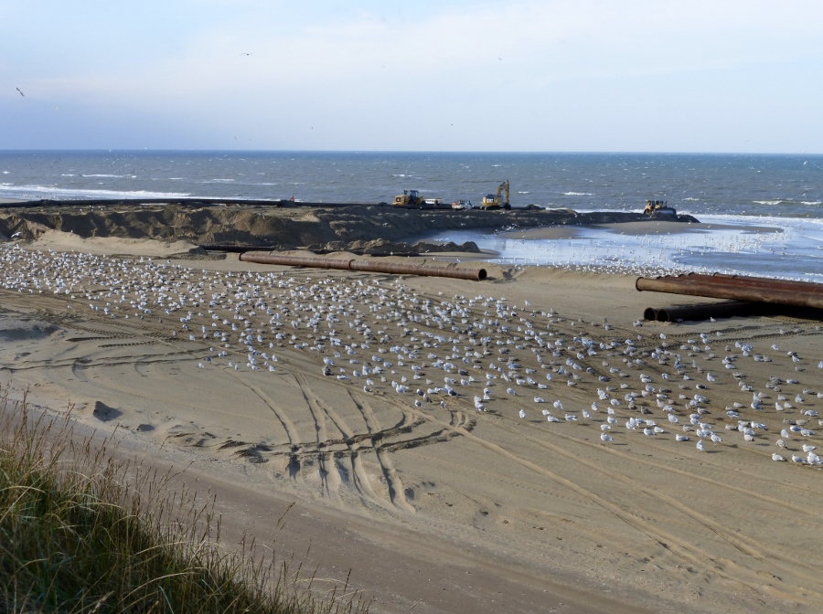Het is nu verboden voor mensen om op het strand te lopen. Meeuwen zijn er echter heel veel. Het opgezogen zand bevat allerlei diertjes die een traktatie vormen voor deze vogels.