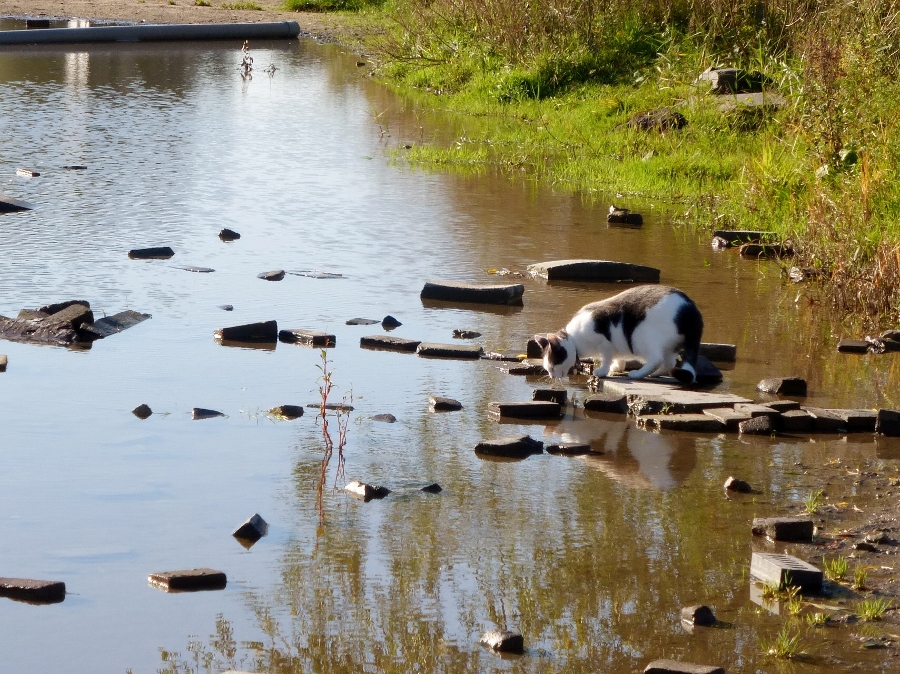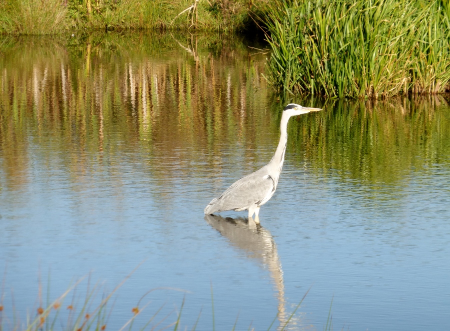 Daarna bezoek ik het natuurgebied Poelgeestpolders aan de andere kant van de spoorlijn. ’s Zomers zijn daar veel vogels te zien, nu vooral eenden, ganzen, meerkoeten en reigers. Een loonbedrijf schept het riet uit de doorgaande sloten. Gezellig rondkuierende schapen hebben een rode veeg op hun achterste.