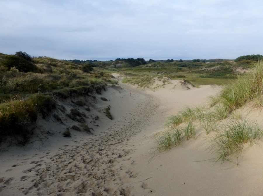 We waren nooit eerder in het binnengebied. Het is bepaald niet gemakkelijk lopen, omdat er alleen maar vage paden zijn, die ook regelmatig een heuvel opgaan of in diepe zandgaten uitkomen. Overigens is er behalve het doorgaande wandelpad langs het fietspad ook een wandelpad aan de oostkant van het duingebied. Dit gaat achter de Estec en de Willem van den Berghstichting langs.