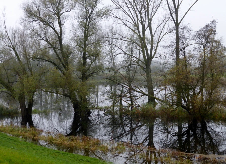 De rode spoorbrug die vandaag in nevelen is gehuld, maakt onderdeel uit van de vorig jaar geopende Hanzespoorlijn van Lelystad naar Zwolle. Zwager Leo en ik waren vorig jaar bij de feestelijkheden op de eerste dag dat deze spoorlijn voor het publiek open was. Vandaag lopen we een stuk in de nabijheid van één van de mooiste rivieren van Nederland, de IJssel.