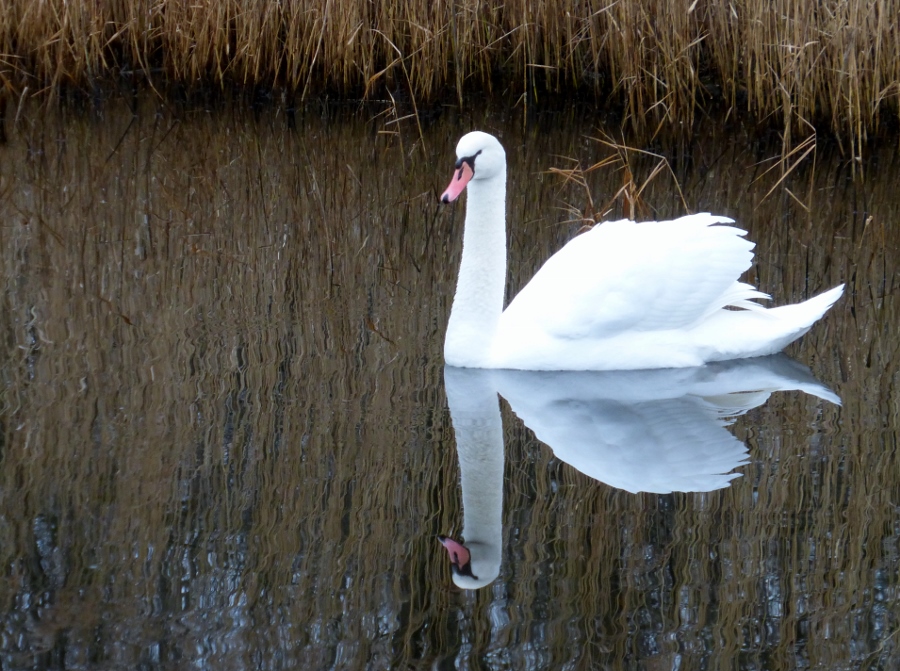 Een laagstaande zon schijnt als we in Landsmeer beginnen met een wandeling door ’t Twiske. Op internet had ik een beschrijving van een route door dit natuurgebied gevonden en een printje hiervan bij me. Als we een half uur onderweg zijn kunnen we de beschrijving niet meer volgen. We hebben waarschijnlijk ergens een verkeerd weggetje genomen.