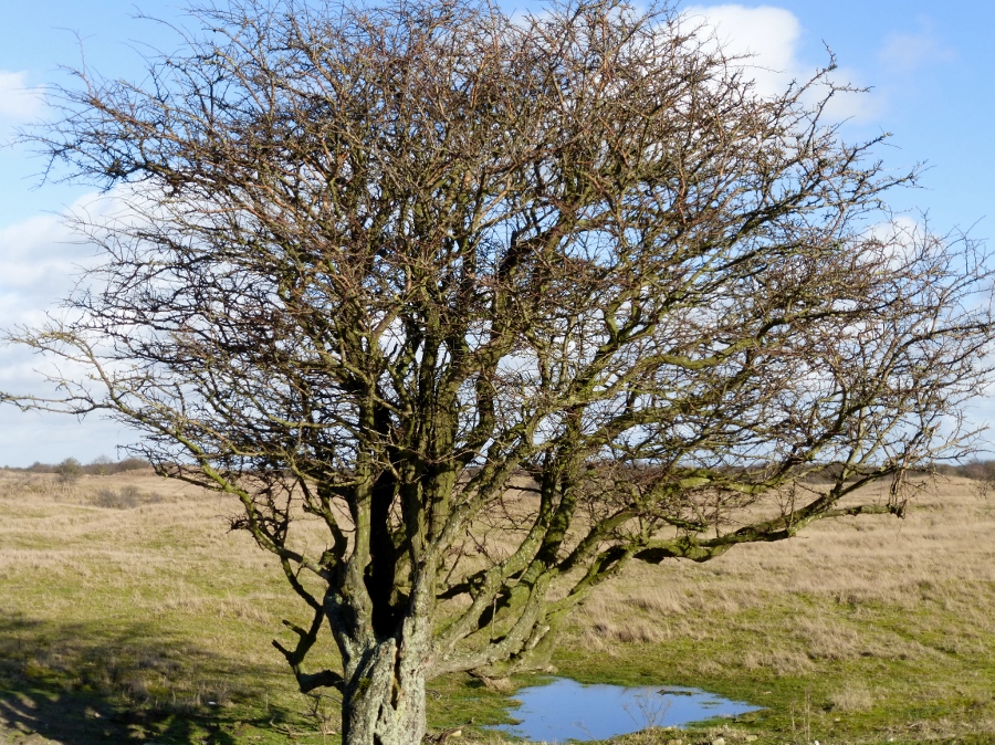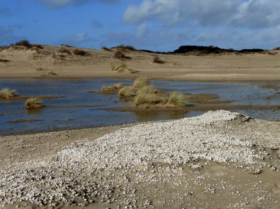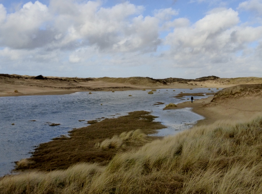 Vanaf het begin van gedempte kanaal, niet ver van het grote parkeerterrein en de paviljoens bij de strandopgang, zet ik mijn voetstappen in het gebied waar ooit het Van Limburg Stirumkanaal was. Hier en daar liggen kleine en soms wat grotere vennetjes. De grond is niet overal even hoog en er zijn geen echte paden. Het is hier daarom struinen in de duinen.