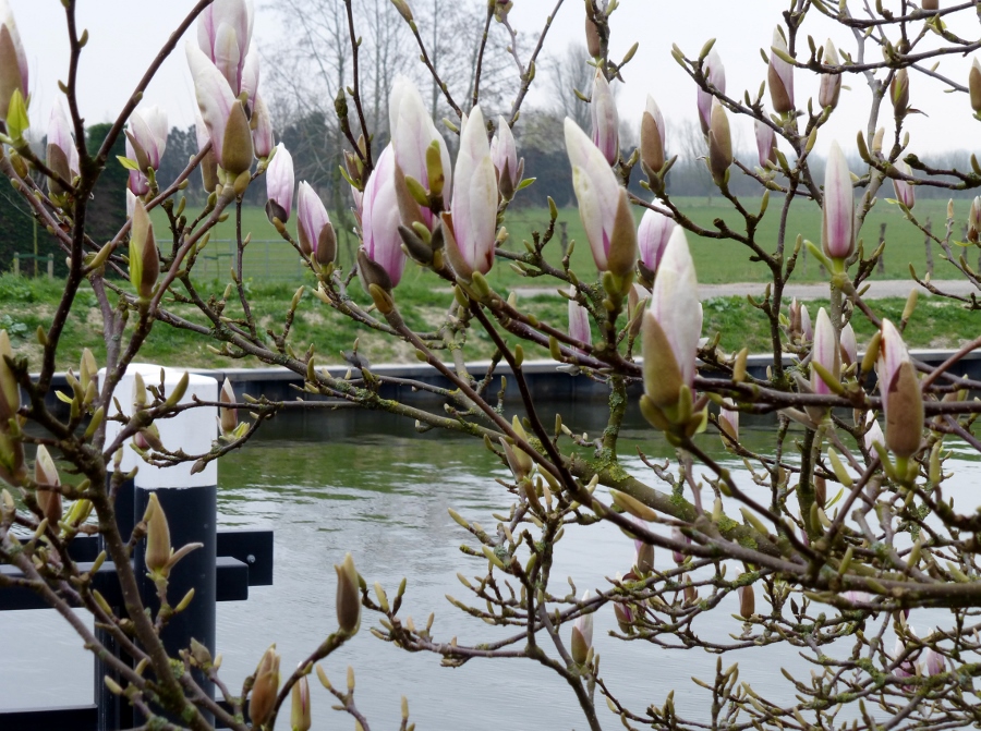 Het eerste dorp na Meerkerk is Arkel. Bij de brug over het Merwedekanaal staat een bankje met zicht op een magnolia in bloei. Als twee ouwe mannetjes nemen we daar plaats om een bakkie koffie uit de thermos te scoren.