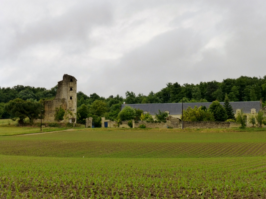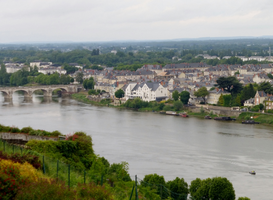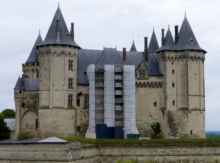 In Saumur staat het imposante kasteel deels in de stijgers. Wij nuttigen ons middagmaal in een eenvoudig restaurant met uitzicht op het kasteel. Ze hebben hier nog van die brandgevaarlijke plafondplaten van kunststof. In het centrum van deze stad is ons keerpunt. We fietsten naar het westen en ga nu weer dichter bij de Loire naar het oosten. Ergens is het oeverpad erg baggerig. Hier nemen we de grotere doorgaande weg.