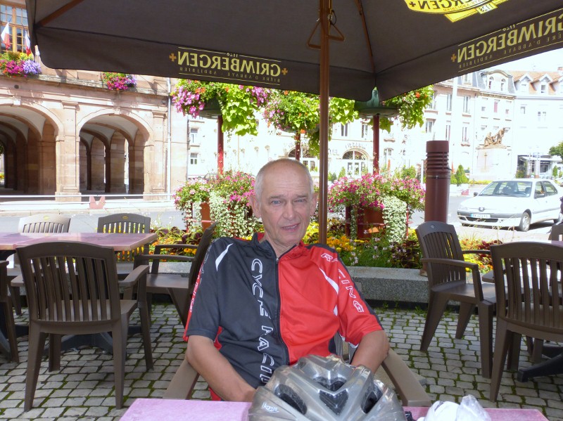 Later komen we in Badonviller een jongeman uit Hilversum tegen, die dezalfde route als wij fietst, maar dan van Zwitserland terug naar Nieuwpoort in België. Naar Raon-l’Etape gaan we door een bos langs Lac Pierre-Percée. In deze stad komen we bij van een fikse afdaling naar deze stad. Op het terras van het café staan grote zonneschermen van Grimbergen Abdijbier.