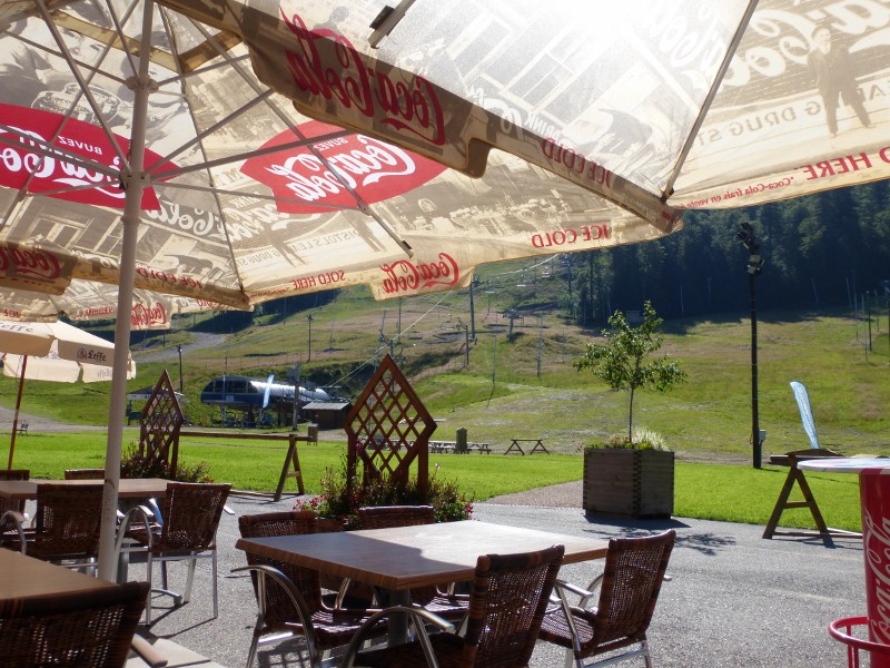 Gisteren passeerden we de 1.000 km van deze fietstocht. Nu gaan we ruim over de 1.000 m hoogte. Na de eerste pas van vandaag en een paar honderd meter hoogteverschil naar beneden, drinken we koffie in een groots opgezet skistation in een wintersportplaats.