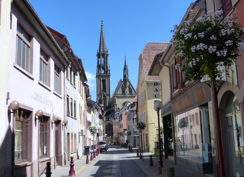 De volgende col van ongeveer 1.000 m hoog kost onze iets minder moeite. Hij is wel iets steiler maar de aanloop is een stuk korter. Als ik afstap omdat de hellingshoek voor mij te groot wordt, fietst Bert rustig verder. Hij is een bikkel. Met veertien haarspeldbochten gaan we een flink stuk nar beneden. Bij dit soort afdalingen heb ik de helm op en mijn hand bij de remmen. We komen in een ander departement. Hier begint de Elzas. Plaatsnemen luiden nu meestal in het Duits, zoals Wildenstein en Mitzach.