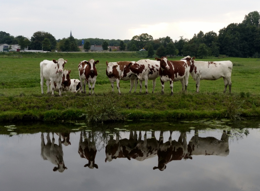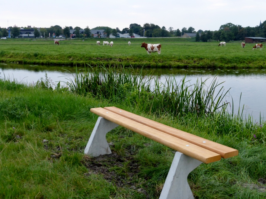 Ik wandelde daar nooit eerder. Eerst kom je langs aangemeerde plezierbootjes en een oude schuit met het opschrift ‘Niets is zonder Gods zegen, 1893’. Verder is een spiksplinternieuw bankje geplaatst. Daar kan je naar de overkant kijken waar koeien je met belangstelling aankijken.