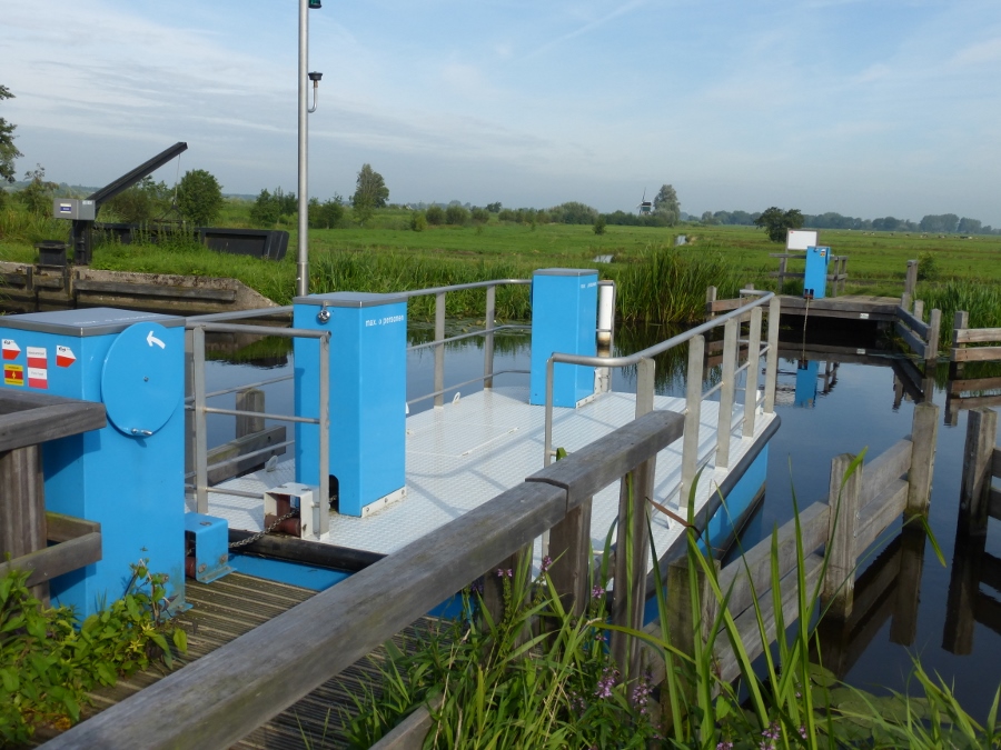 We komen langs een niet al te groot plezierjacht, dat aan de andere kant van het water stil ligt. Ze hebben daar de was buiten te drogen hangen. Dan kan heel goed want het is vandaag mooi weer; een jas of trui hebben we niet nodig. Een stukje voor een gebouw met sluis ligt een motorbootje aan de kant. Een jongeman staat in het gras ervoor te wachten, waarschijnlijk op iemand die met hem mee gaat varen. Aan zijn gezicht is te zien dat hij een hekel aan wachten heeft.