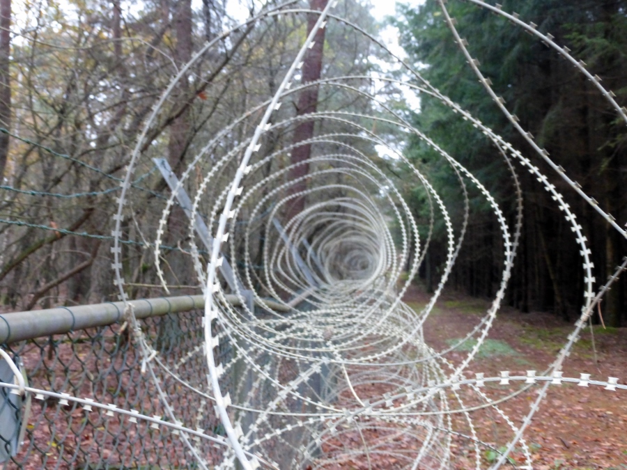 Kamp Zeist werd een paar jaar geleden gebruikt voor het Lockerbieproces. Grote rollen NATO-prikkeldraad liggen nog steeds tegen de afrastering. Op het terrein staat bijna tegen het gebouw aan ergens een picknicktafel. Een paar mannen rookt daar een sigaretje.