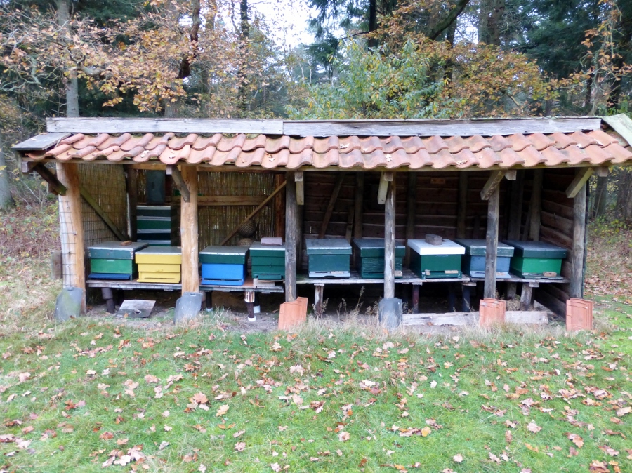 Bij het Witte Huis staat aan de rand van een veldje bijenkasten. Enkele bijeen vliegen naar buiten en naar binnen. Ik dacht dat alle bijen in november zich koest houden in de kast, om te wachten op het voorjaar.