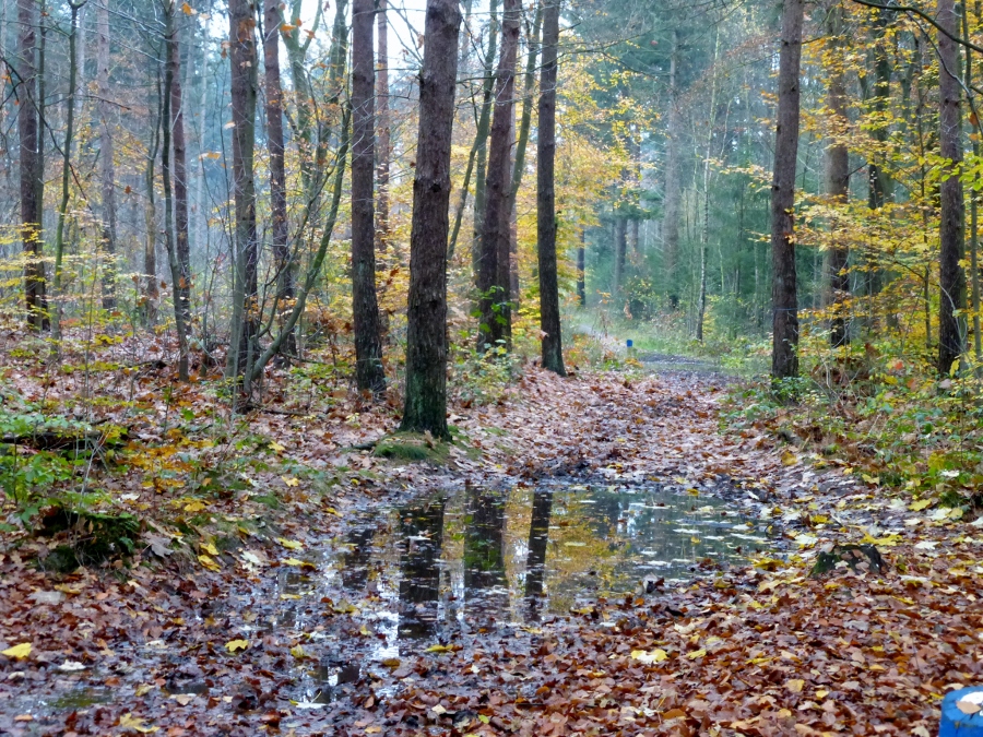 We starten bij het dorpshuis. De vele restaurantjes zijn nog gesloten als we Lage Vuursche uitwandelen. De paden in Pijnenburg, het bosgebied ten zuidwesten van het dorp Soest, zijn vandaag behoorlijk modderig. Dit komt door de overvloedige regenval van de afgelopen dagen. Ook speelt mee dat hier veel bomen zijn geveld waarbij zwaar materieel de paden ruïneren. Een beetje op de randjes van de paden lopen is een goede oplossing. Verderop is er niets mis met de bospaden. Er liggen veel afgevallen herfstbladeren, vooral van beukenbomen.