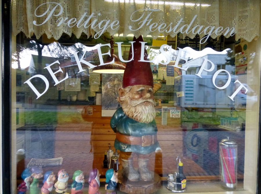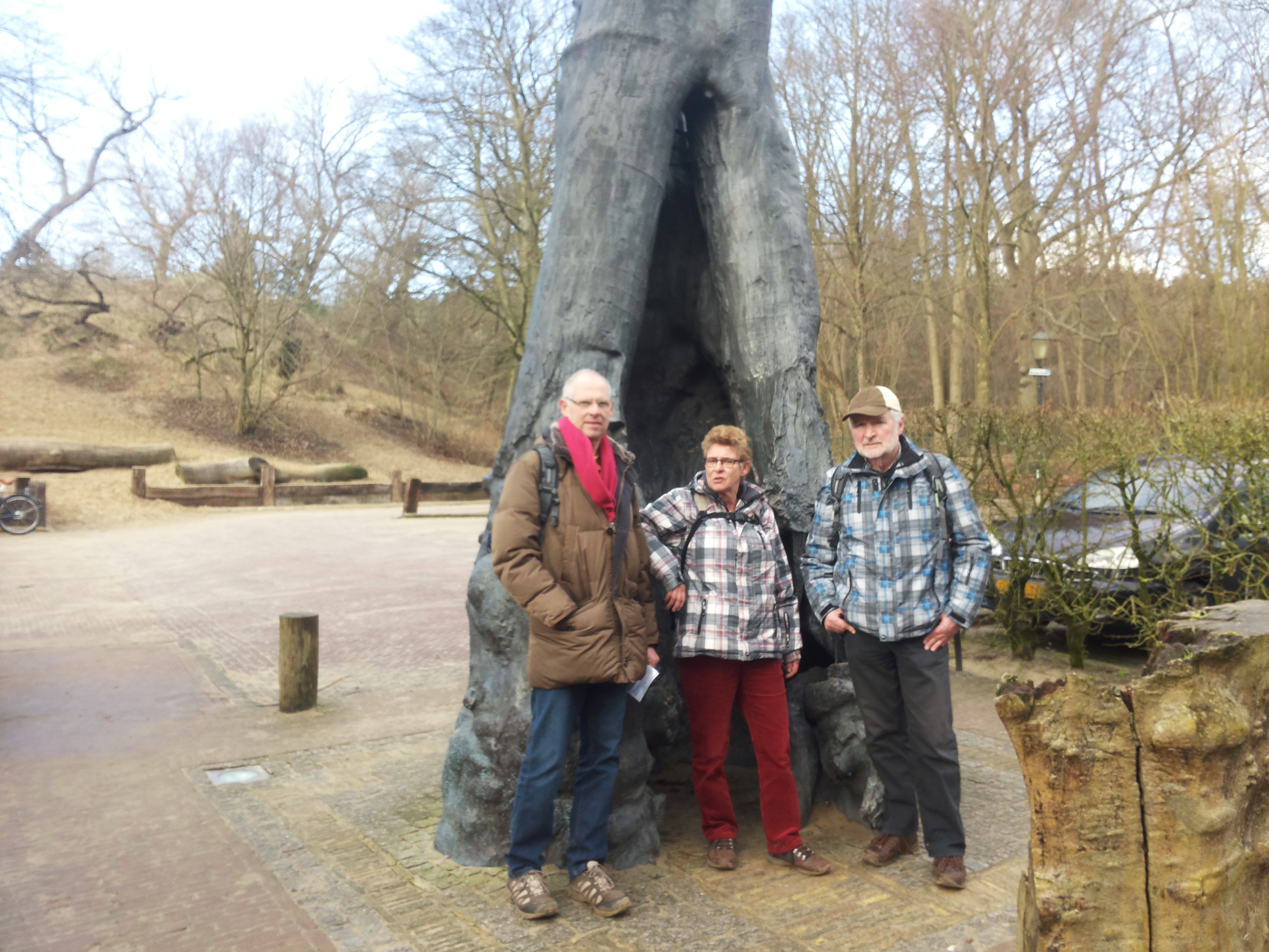 De oude baas zegt: ‘Alle drie koffie?’ We zitten in een koffiehuisje strak tussen het fietspad en de straatweg. Kabouterbeelden en andere prullaria staat om ons heen. Het is krap maar het heeft wel iets. Niet lang daarna groeten we de eigenaar van De Keulse Pot en komen over de Van Alkemadelaan en gaan langs grote indrukwekkende gebouwen en komen uit op een paardenpad in het duin. De grote klok die wordt gebruikt bij de Dodenherdenkingen op de Waalsdorpervlakte mag je niet van dichtbij bereiken. Het toegangshekje is afgesloten met een hangslot.