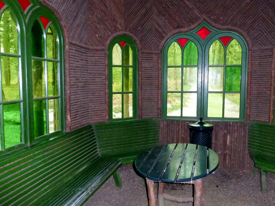 Wat zie je zoal in het bos rond dit paleis? Sprengen (smalle diepe kanaaltjes), een puist in het landschap dat ooit een aarden fort was (Fort Java) met iets wat nog aan een droge gracht doet denken. Verder zijn er verschillende prielen. Eén heet de Willemstempel. Ook is er een hertenkamp met aardig wat herten achter een hek. Later zie ik er ook één in het bos hollen. Dit is een ander soort, een zwartgrijze.