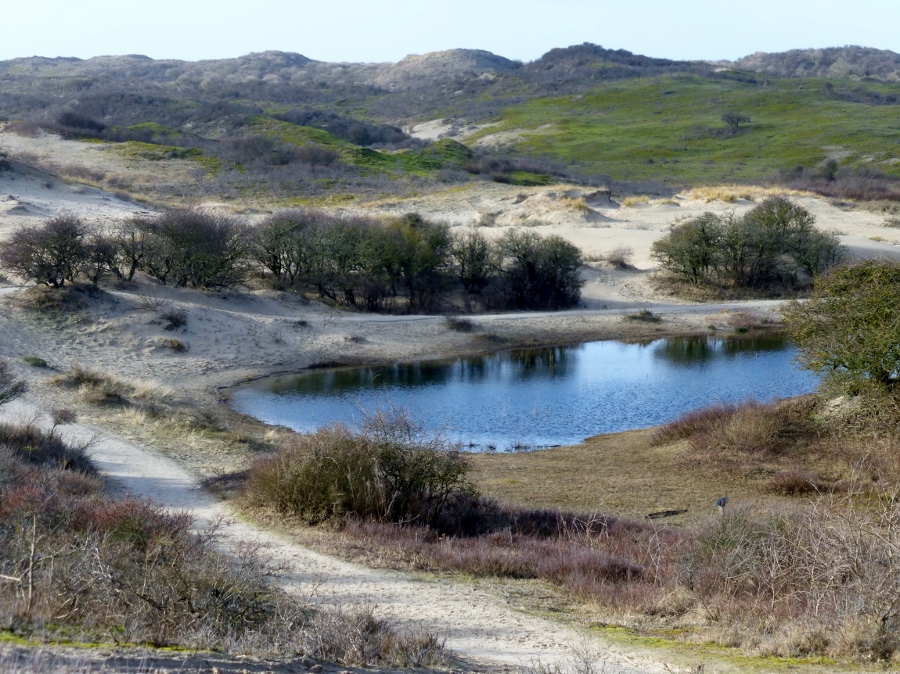 Het is lekker druk in Egmond aan Zee. Hotel Zuiderduin en de kleinere hotels doen goede zaken in de voorjaarsvakantie? Of zijn het vooral dagjesmensen die genieten van het uitzonderlijk mooie weer van vandaag? Niet alleen in het dorp maar ook op het strand zijn we lang niet de enigen. Zo’n drie kilometer verder gaan we een uitdagende bult over om aan de andere kant een groots uitzicht te hebben op het duingebied ter hoogte van Het Woud.