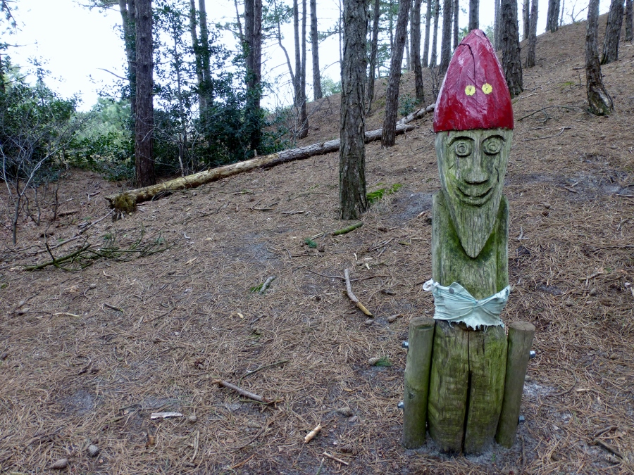 Met uitzicht op het Speelduin gaan we aan de koffie. De vriendelijke serveerster legt ons uit hoe we het beste weer op onze wandelroute door de duinen kunnen komen. De duinen bij Schoorl zijn niet alleen breed maar ook behoorlijk hoog. We lopen door een gebied dat een aantal jaren geleden door een bosbrand werd getroffen. Veel stammen van dennenbomen zijn nog steeds zwartgeblakerd, voor zover ze niet het loodje hebben gelegd.