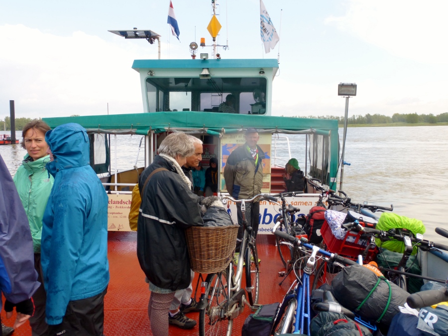 Het regent vandaag zo nu en dan licht. Bij het restaurant De Gelderse Poort willen we over met het pontveer. Omdat die vandaag maar één keer per uur gaat, hebben we drie kwartier de tijd voor een kop soep. Later komt er nog een groep van vier gezinnen (acht volwassenen en acht kinderen) binnen. Die bestellen niets, maar de kids krijgen toch een lolly van de serveerster. Een aardige geste.