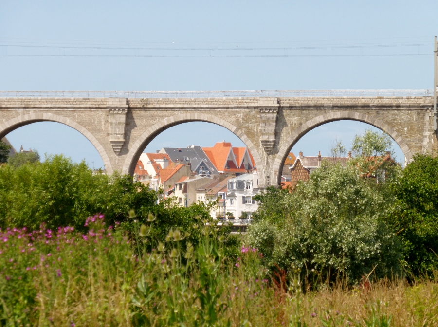In Wimereux zijn we bij de zee, of om preciezer te zijn aan het Nauw van Calais, het smalle water tussen de Noordzee en de Atlantische Oceaan of anders gezegd tussen Frankrijk en Engeland. Het zicht is niet helemaal helder. Ik denk Engeland niet te zien, Bert denkt van wel. Vanuit Wimereux fietsen we zuidwaarts langs de kust naar Boulogne-sur-Mer. Deze grote en drukke havenstad is ons keerpunt. Later raken we wat in verwarring omdat de GPS-routemaker een eigen interpretatie heeft gegeven aan de rit vanaf Boulogne. Het lukt toch wel aardig met alleen het boekje, alleen in Desvres moeten we wat zoeken en rijden daar prompt ook een paar kilometers op een drukke weg verkeerd, stevig omhoog.