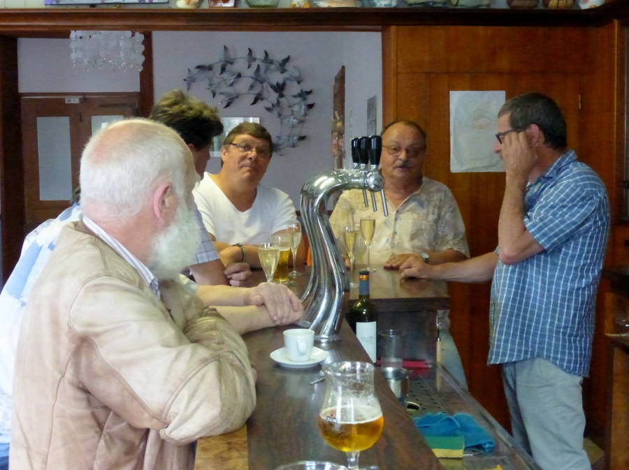 We gaan terug naar Bousis, waar gisteren in de namiddag een wielerwedstrijd werd gehouden. De kermisattracties staan nog op de pleintjes van het dorp. De bakker is wel open. Dus kopen we hier onze pains au chocolat. We zien daarna dat het café aan de andere kant van de poort naast de bakker juist open gaat. Wij zijn de eerste klanten. Al heel snel schuiven lokale bezoekers naar binnen. Sommigen geven je een hand.